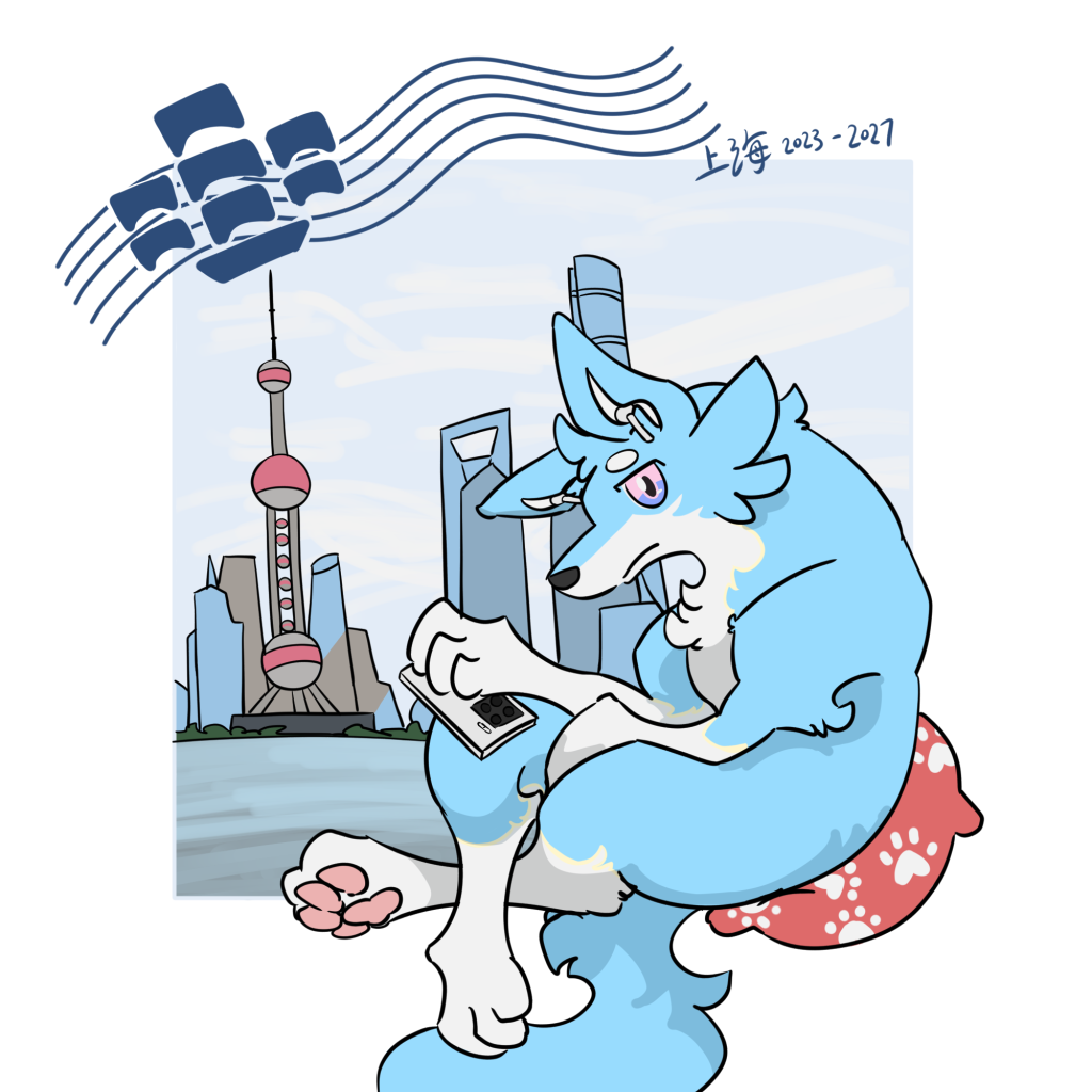 我考入了上海海事大学就读本科网络工程专业,临港人群稀少,我在这里调整、尝试、探索人生方向。我一直都喜欢小动物,为了和以前的自己做区分,我起了新网名“粉糖粒子”,一个比较可爱粉亮的名字。并且我设计了第一个兽设,他是我的映射,没有名字。遇到的好友们叫他“小蓝狗”。网名随后简化为粉糖并改成我现在的群组名称。